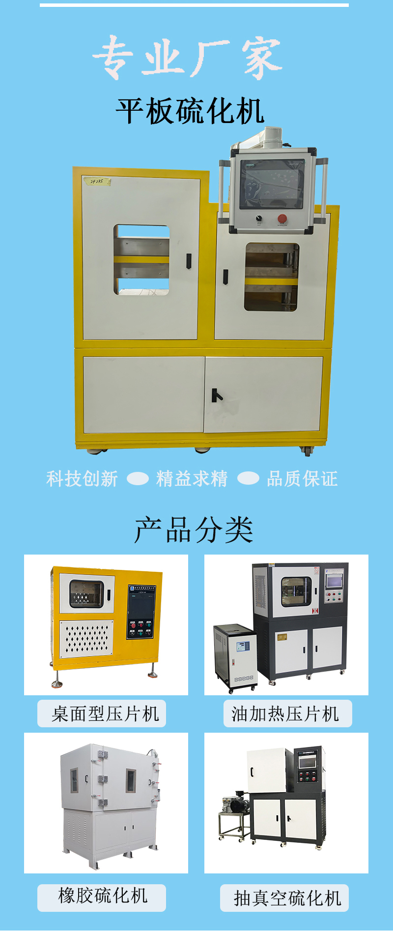 壓片機(jī)又名平板硫化機(jī),主要用于硫化平型膠帶(如輸送帶、傳動(dòng)帶,簡(jiǎn)稱平帶),屬于液壓機(jī)械,平板硫化機(jī)的主要功能是提供硫化所需的壓力和溫度。壓力由液壓系統(tǒng)通過(guò)液壓缸產(chǎn)生,溫度由加熱介質(zhì)(通常為蒸汽、導(dǎo)熱油等,過(guò)熱水也有用)所提供。輸送帶平板硫化機(jī)主要用于硫化平型膠帶、膠板、高分子等平板類產(chǎn)品的成型,它具有熱板單位面積壓力大,設(shè)備操作可靠、維修量少等優(yōu)點(diǎn)。溫度由加熱介質(zhì)(通常為蒸汽、導(dǎo)熱油等)所提供。 平帶平板硫化機(jī)按機(jī)架的結(jié)構(gòu)形式主要可分為柱式平帶平板硫化機(jī)和框式平帶平板硫化機(jī)兩類;按工作層數(shù)可有單層和多層之分:按液壓系統(tǒng)工作介質(zhì)則可有油壓和水壓之分。